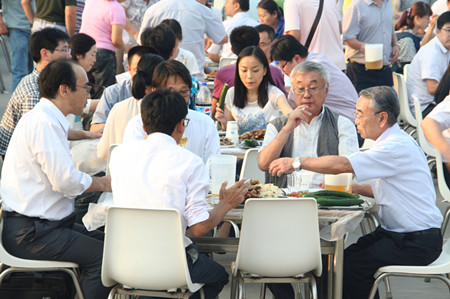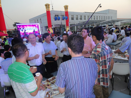 17:30,志賀進(jìn)總經(jīng)理端著酒杯,走到舞臺(tái)前,首先感謝廣大員工的辛勤努力,使公司取得很好的業(yè)績(jī),隨著一聲“干杯”,荏原博泵第五屆納涼晚會(huì)拉開了序幕。公司380多名員工,分部門有序而坐,大家推杯換盞,興高采烈。公司領(lǐng)導(dǎo)挨桌給員工們敬酒,大家沒有了上下級(jí)的拘謹(jǐn),一派歡樂祥和的景象。